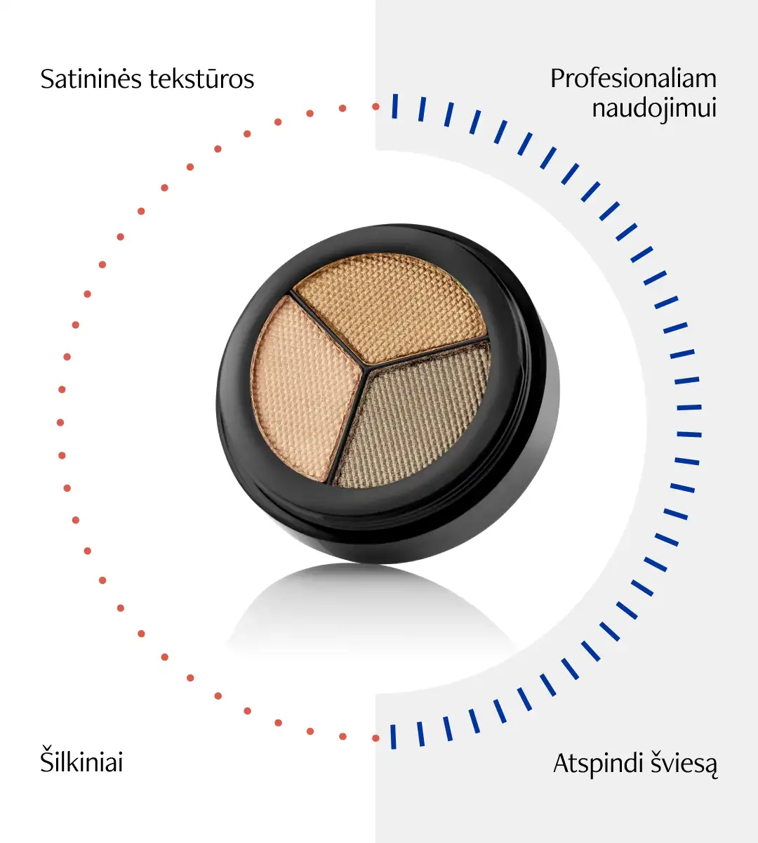 Šilkinė akių šešėlių tekstūra, savo formulėje turint itin smulkius šviesą atspindinčius perlus, kurie sukuria satininį užbaigimą akių makiaže. Produktas nedirgina akių.